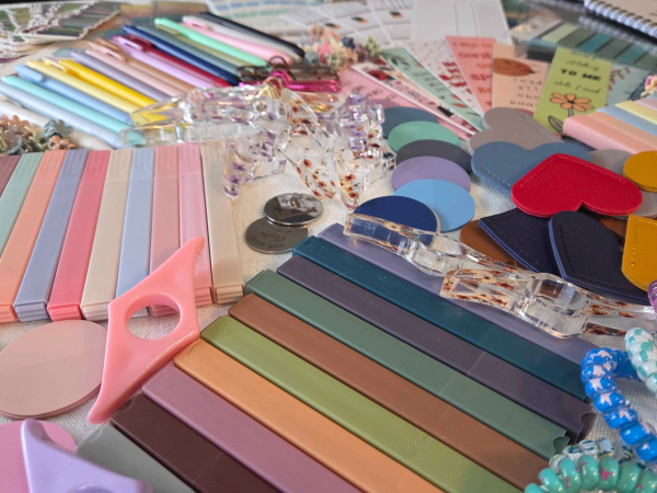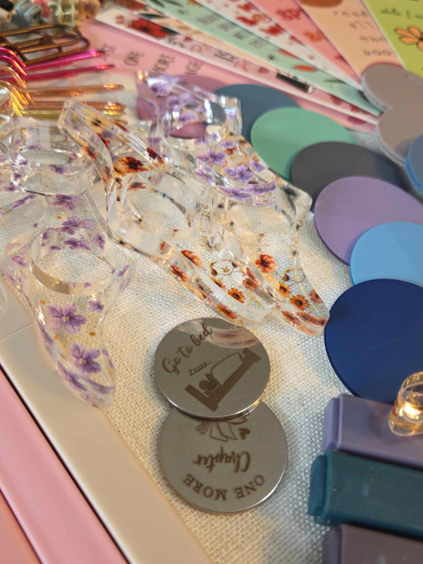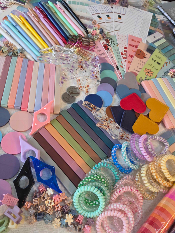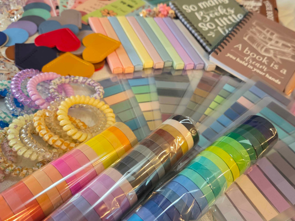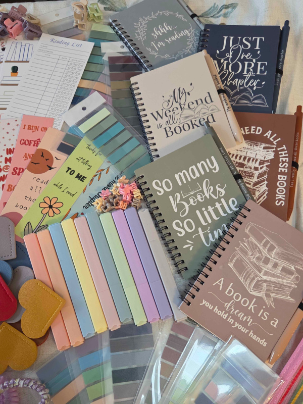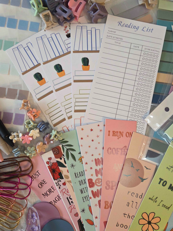 Possible items include a variety of different styles of bookmarks, highlighters, pens, reading log sheets, colorful washi tape rolls, a huge variety of sticky notes and tabs, acrylic thumb book holders, hairclips, hairties, small notebooks with matching pens, and pouches. These are perfect for book lovers, annotators, and journaling!